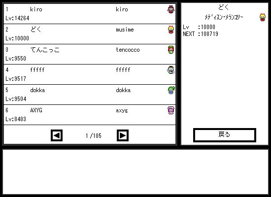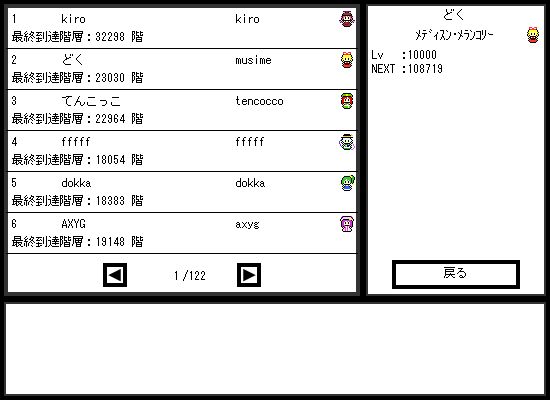 http:// たのしい放置ゲー 何を血迷ったかそこそこ真面目にプレイ(?)してしまっているのであった。 基本はLVが上がったらポイントをほんの少しだけ体力に、 残りを筋力(攻撃力)とカリスマ(防御力)だけに割り振って また探索させてLV上げの繰り返し。 ある程度LVとアイテムが溜まったらスペルカード作成。 なるべく消費霊力が多くならないようしつつ 筋力とカリスマのブースト&発動時の霊力回復が 高くなるように組んで常時スペル発動状態で探索。 霊力の最大値を高くしておくと自然回復も早まり 霊力切れしてもすぐに再発動するので放置してても安心。 1ターンで回復する量をスペルの消費量以上にすれば ほぼやられる要素が無くなります。 スペルループに気付いて初めは発動の間を3ターンにして 睡眠放置していたのですが、約4時間後にふと目が覚めて 画面を眺めていると目の前でちょうどその3ターンの間に 1000*3を喰らってやられてしまいました。 みんなも長時間放置するときはちゃんと間1ターンにしようね! というわけでうちのメディスン・メランコリーこと どくさんは今も元気に探索しているのであった。 今日のファイナルファイト ・回れマイク 5面ナイフ地帯で市長の必死の回転もむなしく 間合い外からナイフで突かれまくって肉を取る間もなく1ミス 5面アビ戦でなんだかよくわからないうちに2ミスEND ・ゲイブレード 5面ナイフ地帯でいつも通り神プレイされて1ミスもうやだここ 6面館内中盤でデブに謎ダメージ喰らってドア前は頑張るも1ミス 6面最終防衛ラインを神ゲイブレで突破するも ベルガーの処理に手間取ってクロスボウブレイク 本日のマッドギアMVP アフガン 敢闘賞 ベルガー 市長でのアビ2ミスは忘れるとして ゲイブレ持ってのベルガー戦で負けたのが痛かったです。 ベルガーの掴み外し運が無かったと言えばそうなのですが そもそもゲイブレあれば掴みに行く必要は無かったはず。 もっと落ち着いて斬りに行くべきでした。 5面紛争地帯は( ´∀`)つミ 本日のファイナルファイト ・ゲイ